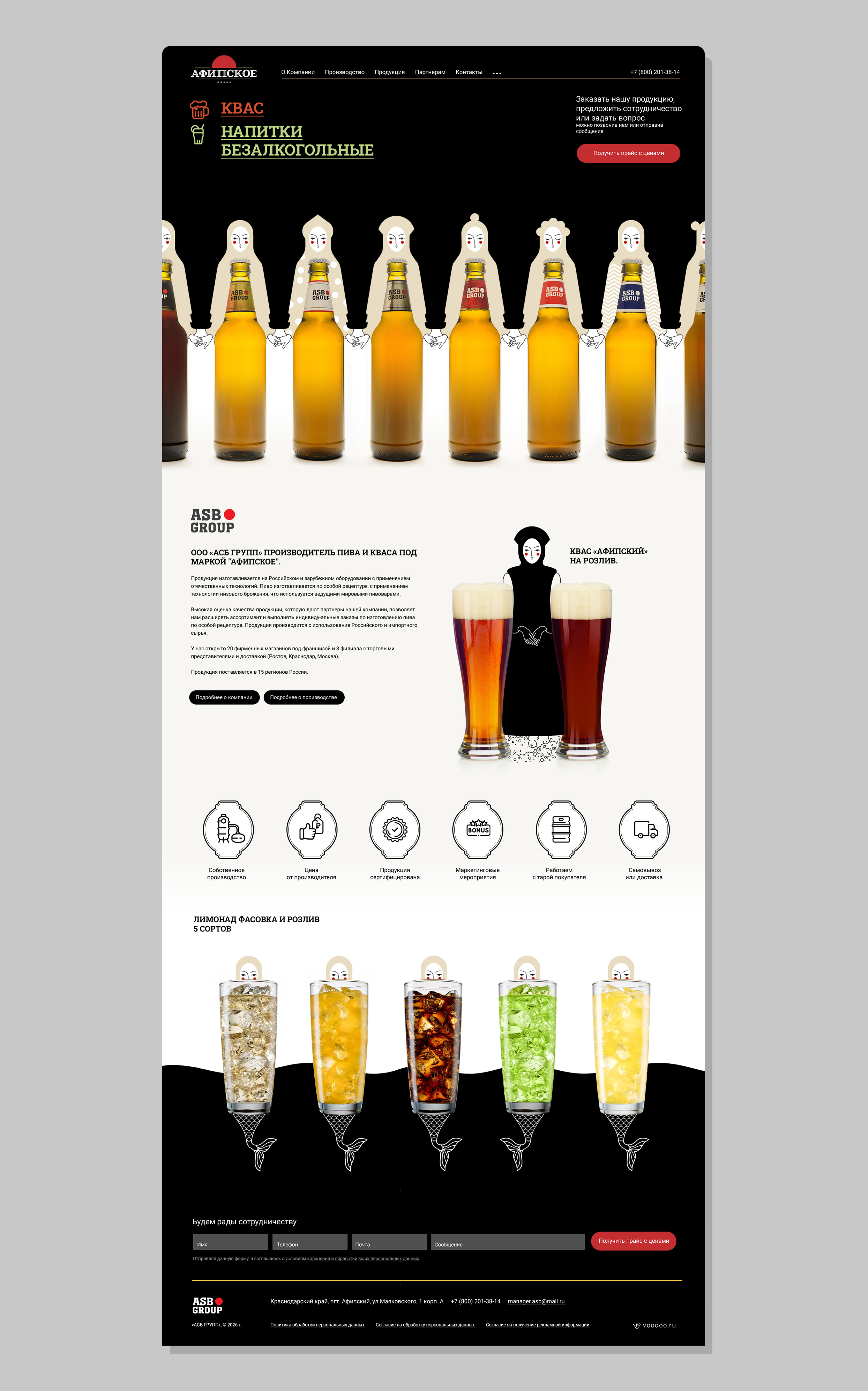 Эксклюзивные иллюстрации с использованием фото продукции. Игра с формами тары, заключение данных форм в ритм, движущиеся элементы (фоновые волны) во время прокрутки, — все это создает яркое впечатление на пользователя.